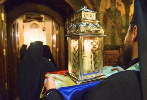 În acea perioadă, deasupra Sfântului Mormânt se coboară un foc din cer, care se manifestă în moduri diferite în fiecare an și are particularitatea de a nu frige în primele momente.
